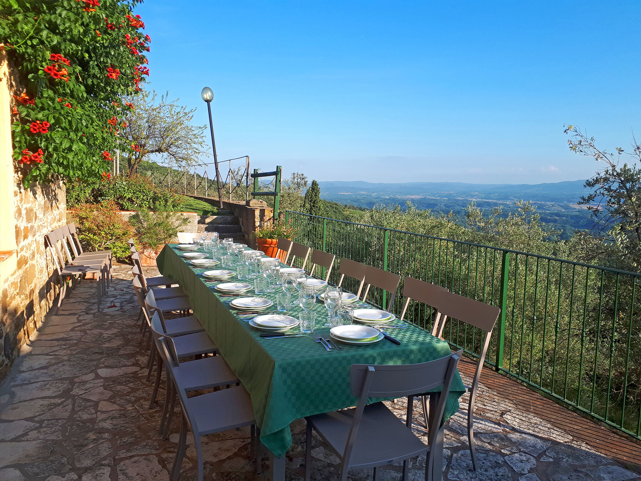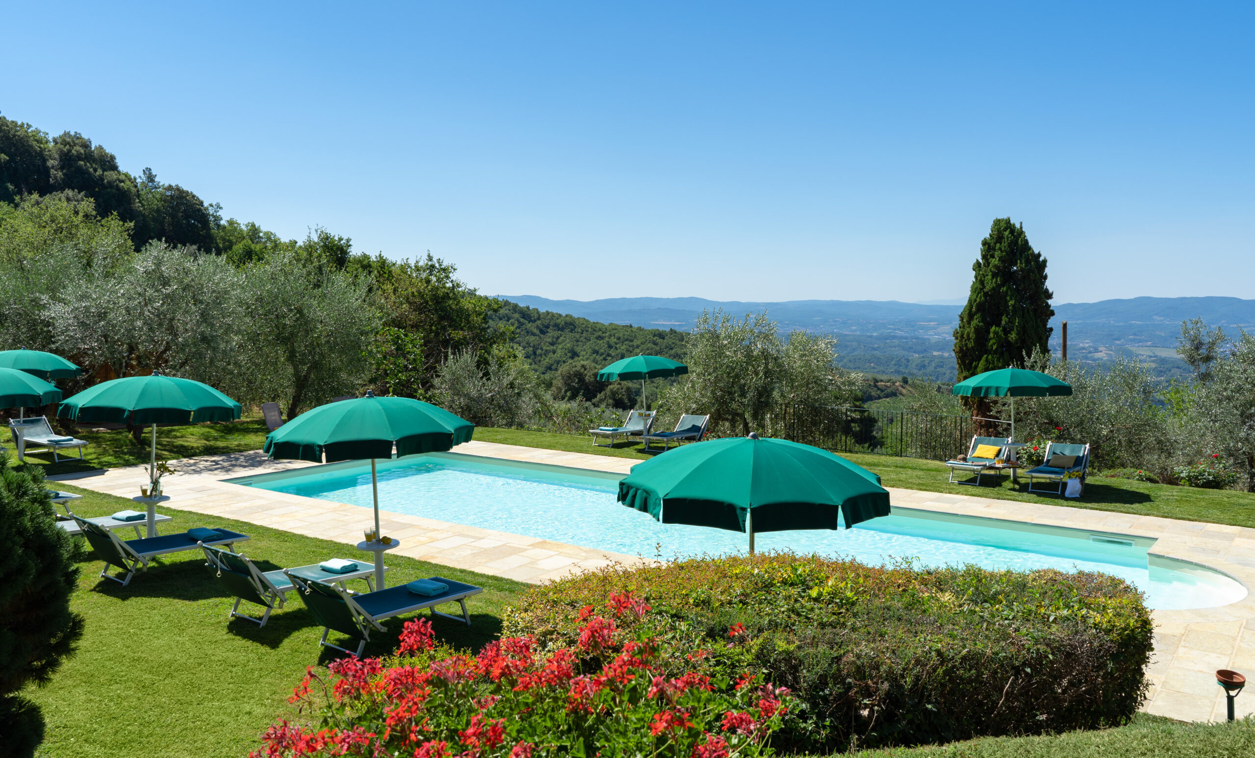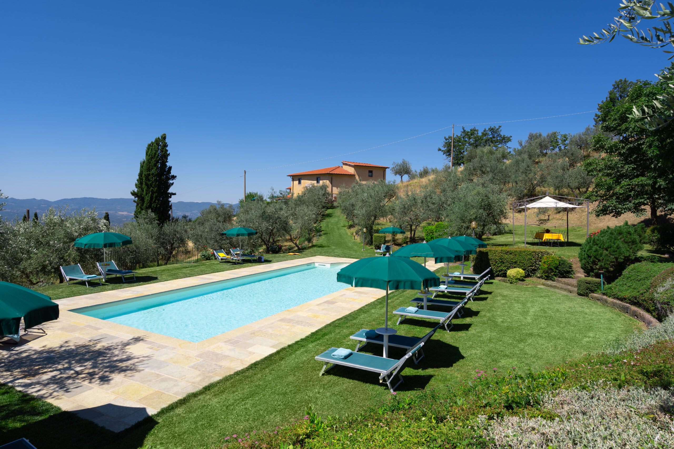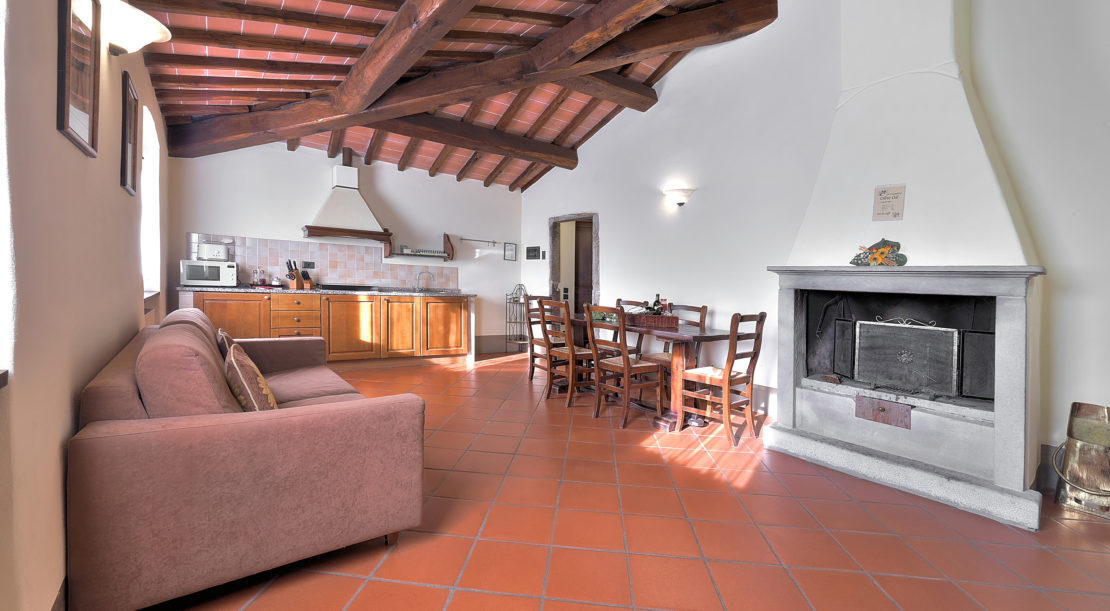 The house features six independent apartments, that can be rented separately or in combination. Each flat has one or two double bedrooms and sleeps from 2 to 6 persons; the whole villa can sleep up to 24 persons. All the apartments are furnished in classic Tuscan style, and each one has its own equipped kitchen, bathroom and private garden area outdoor. They all share the swimming pool and the terrace with view.